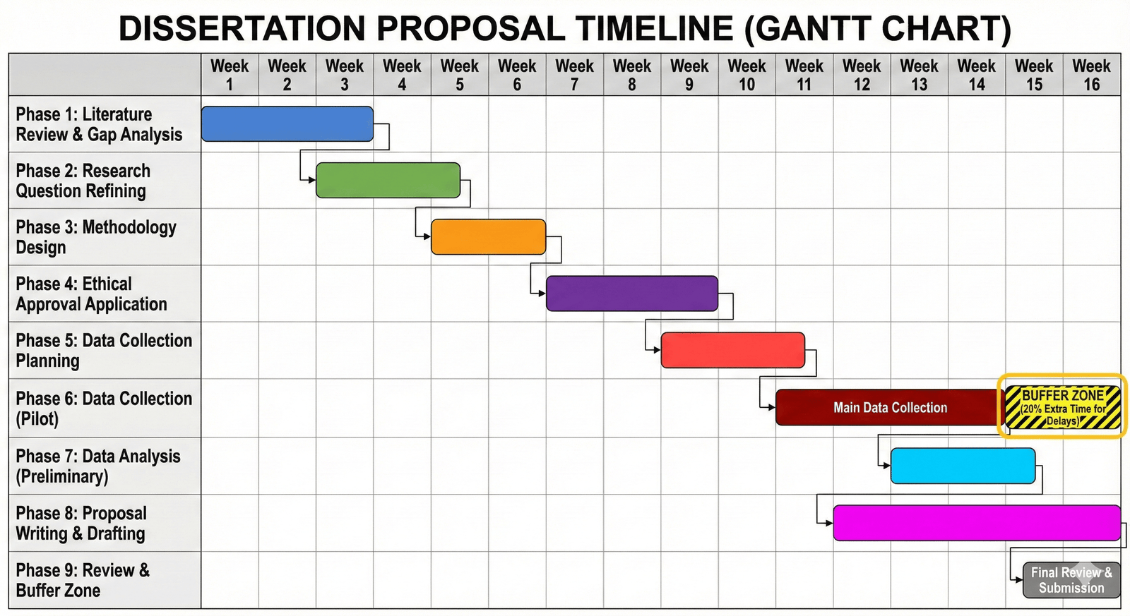 The “Buffer” Method. After auditing 10,000+ student timelines, we recommend adding a 20% “Buffer Zone” to your data collection phase. Participants will be late, and the software will crash. If your timeline is too tight, your supervisor will reject the proposal as “Unrealistic.”